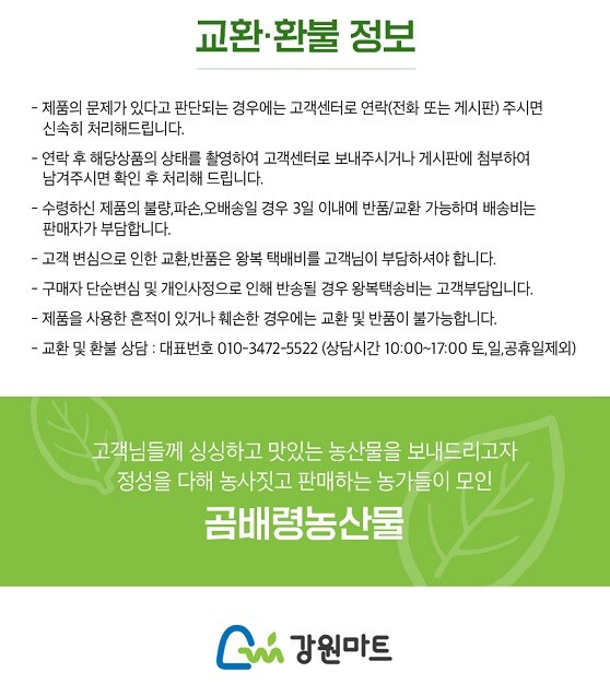 통신판매업 신고 : 강원인제 0049호 | 연락처 : 010-3472-5522 | FAX : 033-461-0713 | 개인정보보호 책임자 : 김진경 | 대표자 : 김경구